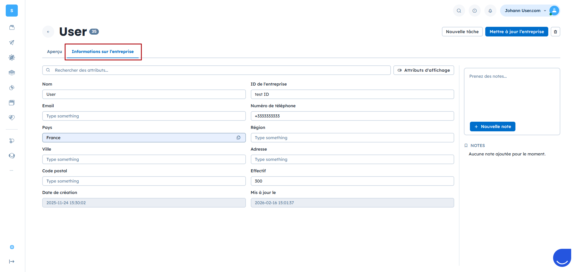 Informations sur l’entreprise - vous pouvez créer une note ou rechercher des attributs standards ou personnalisés afin de suivre toute donnée pertinente pour votre activité.
