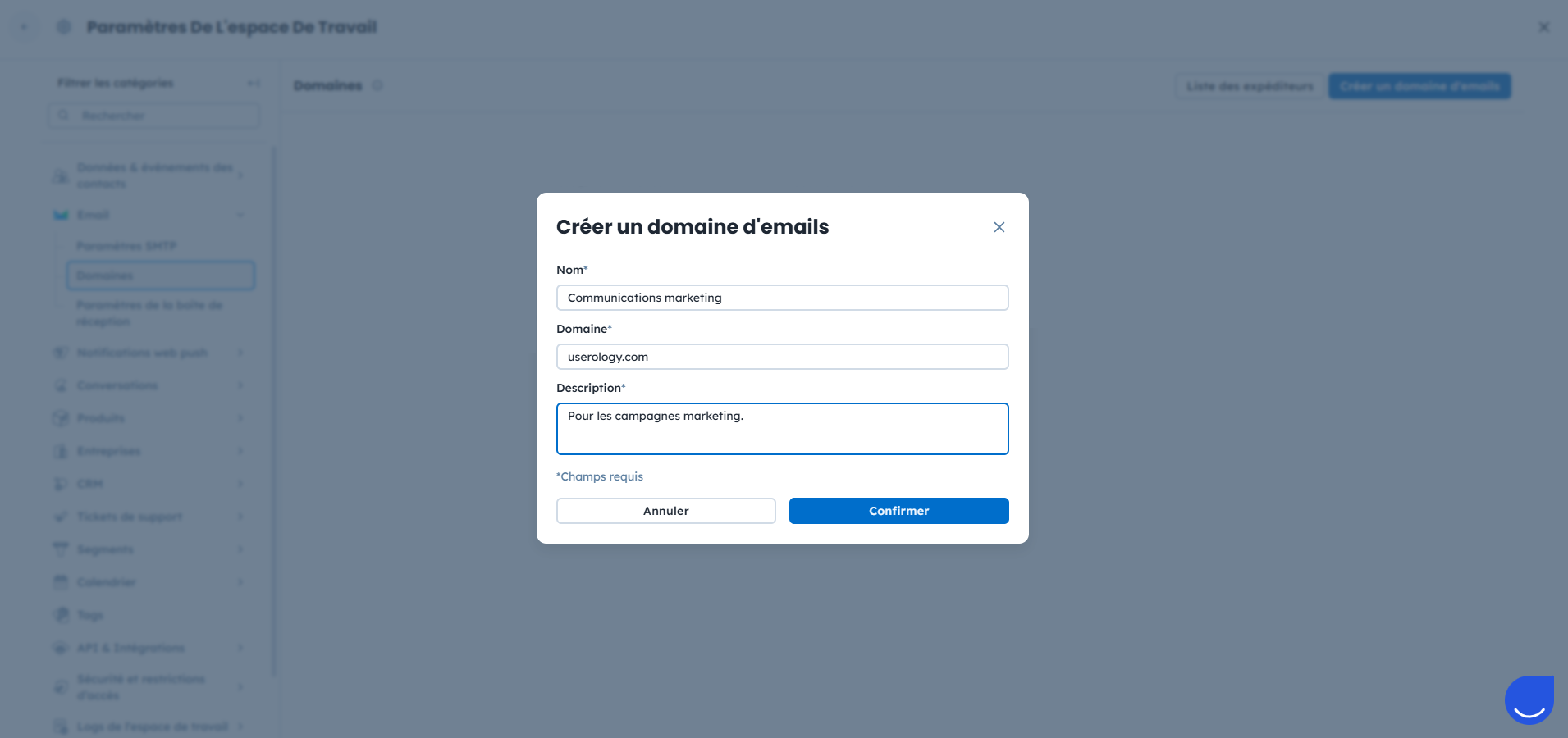 Domaine : le domaine depuis lequel vous souhaitez envoyer des emails. Exemple : userology.com