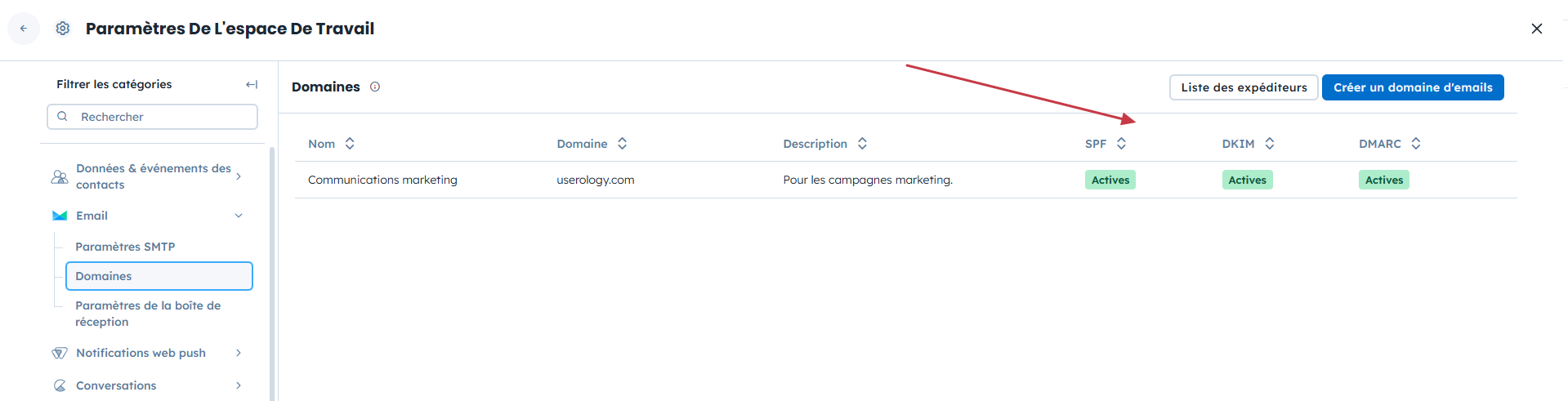 Accédez à : → Paramètres de l’espace de travail → Email → Domaines.