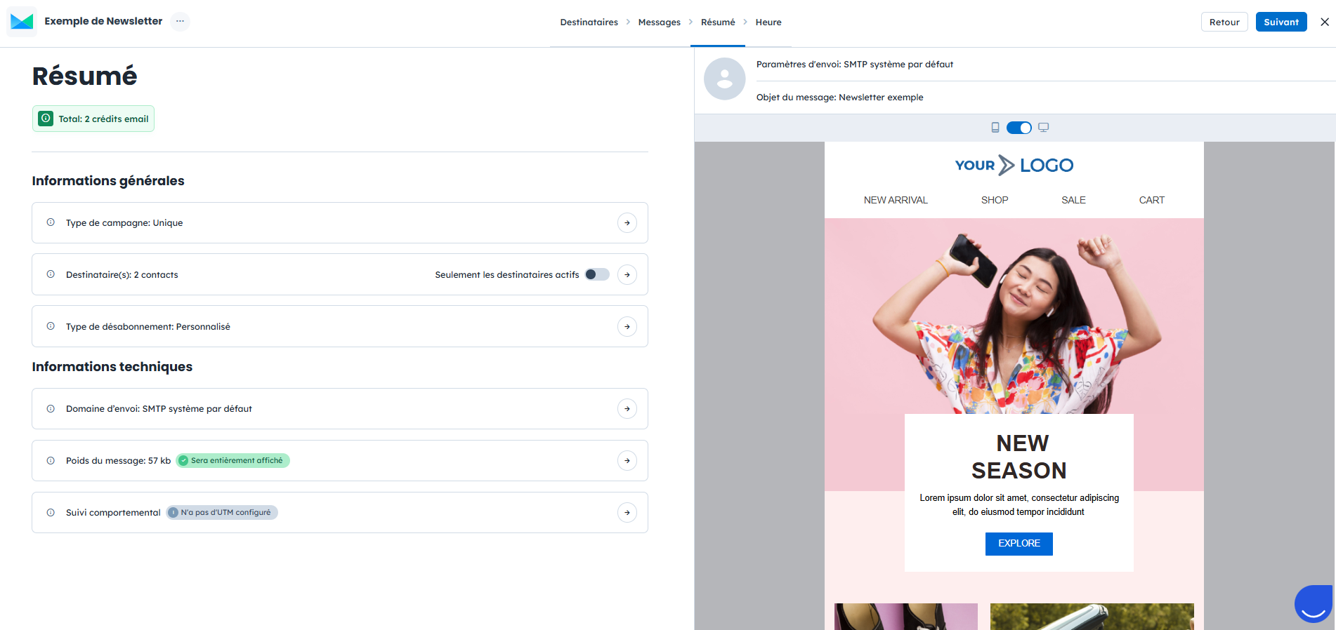 Avant d’enregistrer la version finale, vous pouvez prévisualiser l’email et tester son rendu en vous envoyant un message de test.