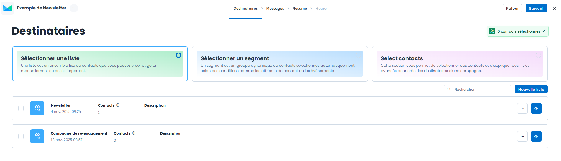Vous devez maintenant sélectionner les destinataires de la campagne. Trois possibilités s’offrent à vous :