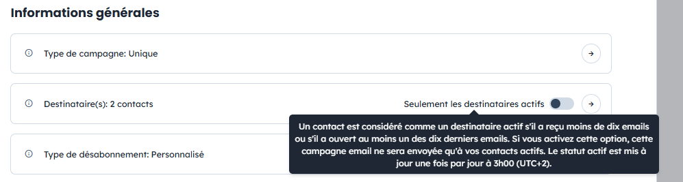 Vous pouvez également choisir l’option “Seulement les destinataires actifs” pour ne cibler que les contacts ayant ouvert au moins 1 des 10 derniers emails envoyés.