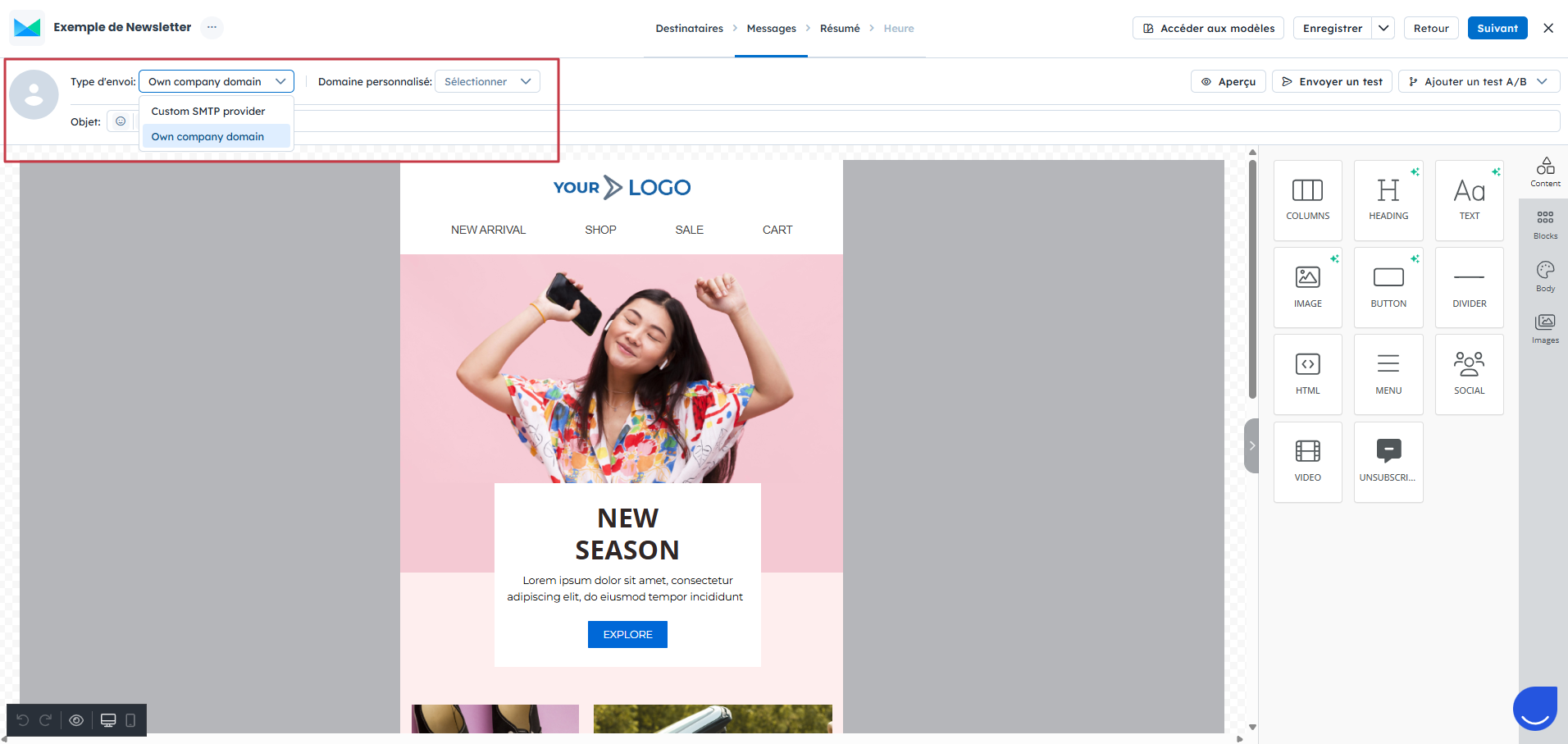 Sélectionner le domaine et l’expéditeur de la campagne.