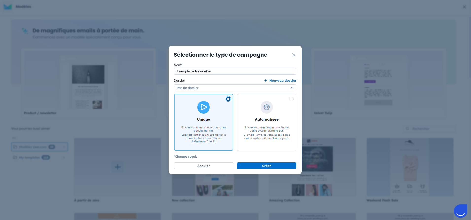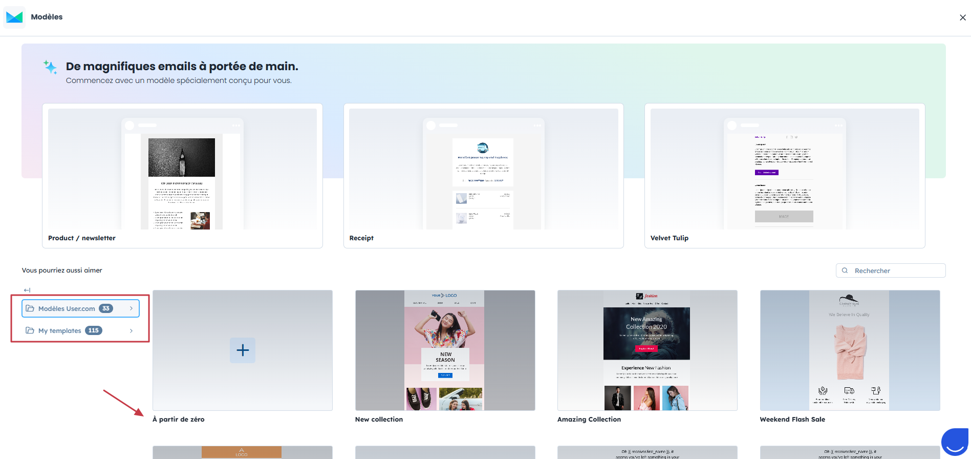 “Modèles User.com” : des templates préconçus que vous pouvez modifier et adapter à vos besoins.