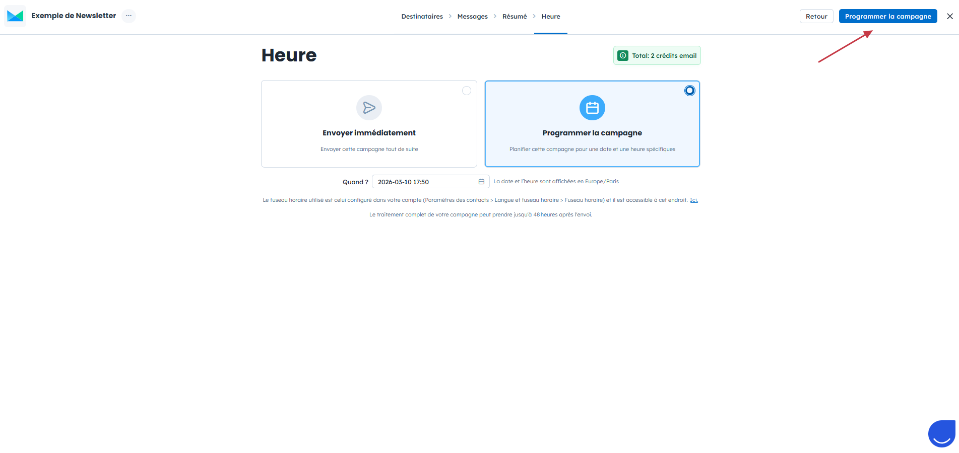 La dernière étape consiste à définir le moment d’envoi de la campagne email.