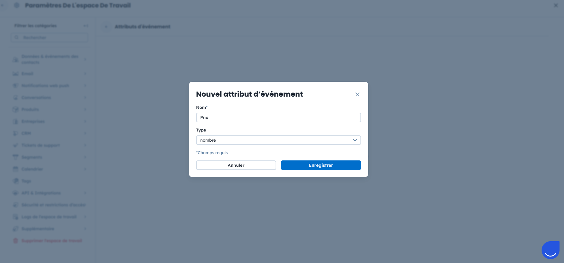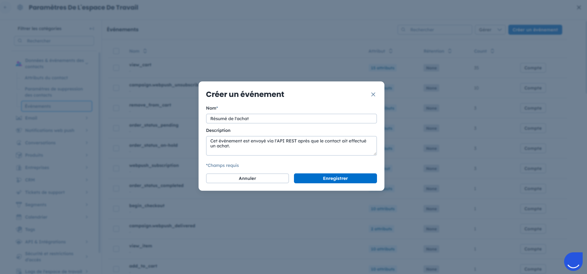 Pour créer un événement dans l’application : allez dans Paramètres → Paramètres de l’espace de travail → Données & événements des contacts → Événements → Créer un événement.