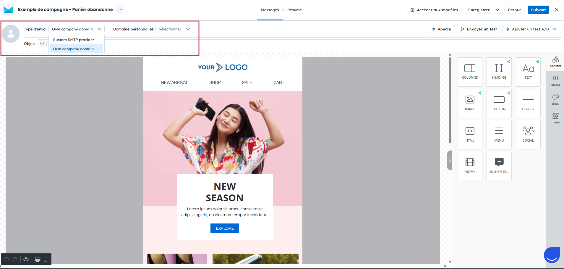 Sélectionner le domaine et l’expéditeur de la campagne.