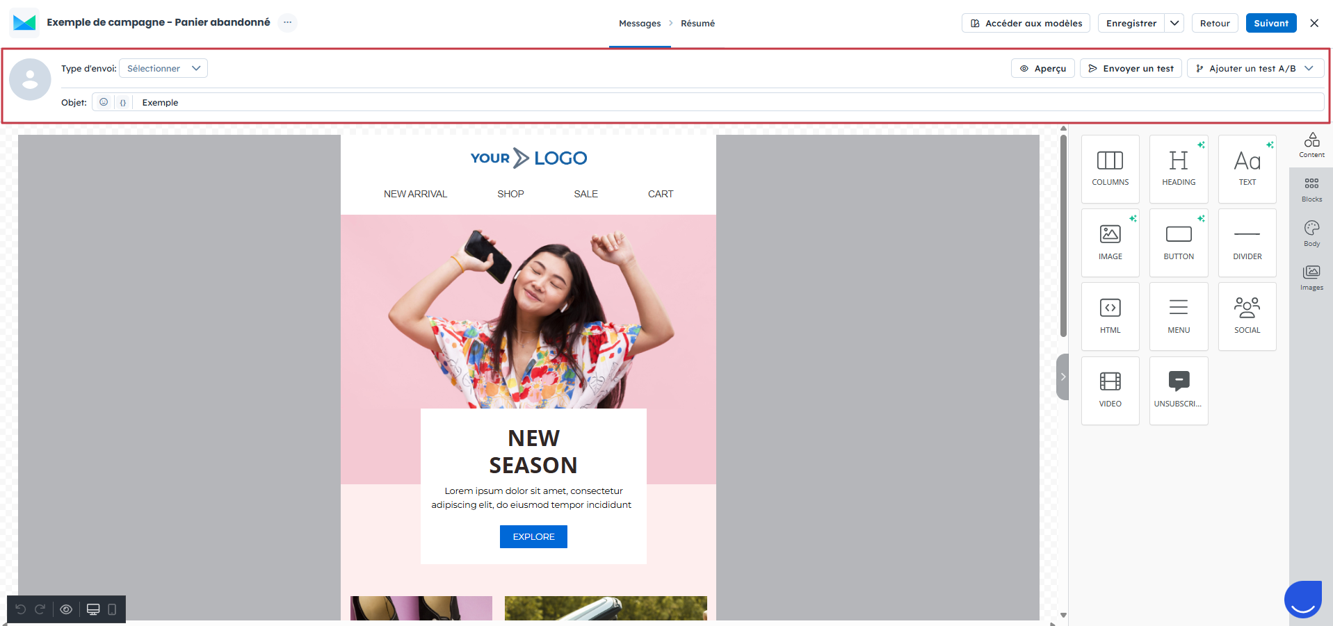 Vous pouvez personnaliser le contenu de votre email en y ajoutant différents éléments visuels et du contenu dynamique. Si besoin, vous pouvez également changer de modèle en cliquant sur le bouton “Accéder aux modèles”.