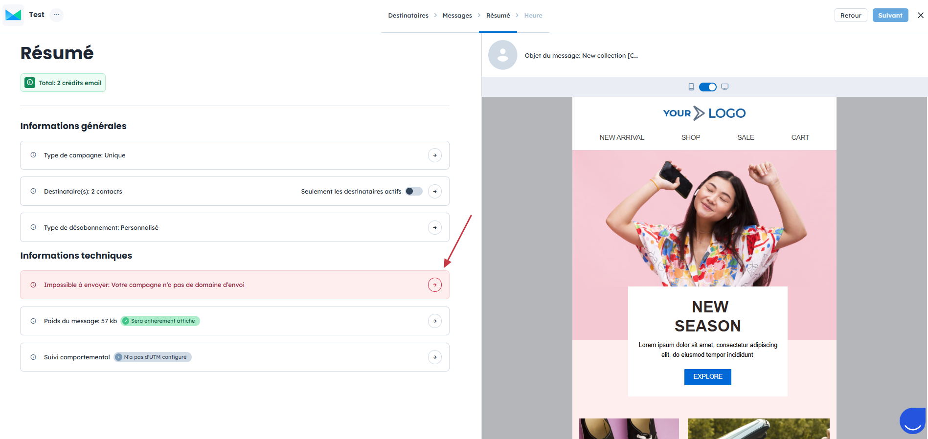 Enfin, à l’étape “Résumé”, le système affiche à nouveau les paramètres choisis. Si une anomalie est détectée dans la configuration de l’expéditeur, une alerte s’affichera.