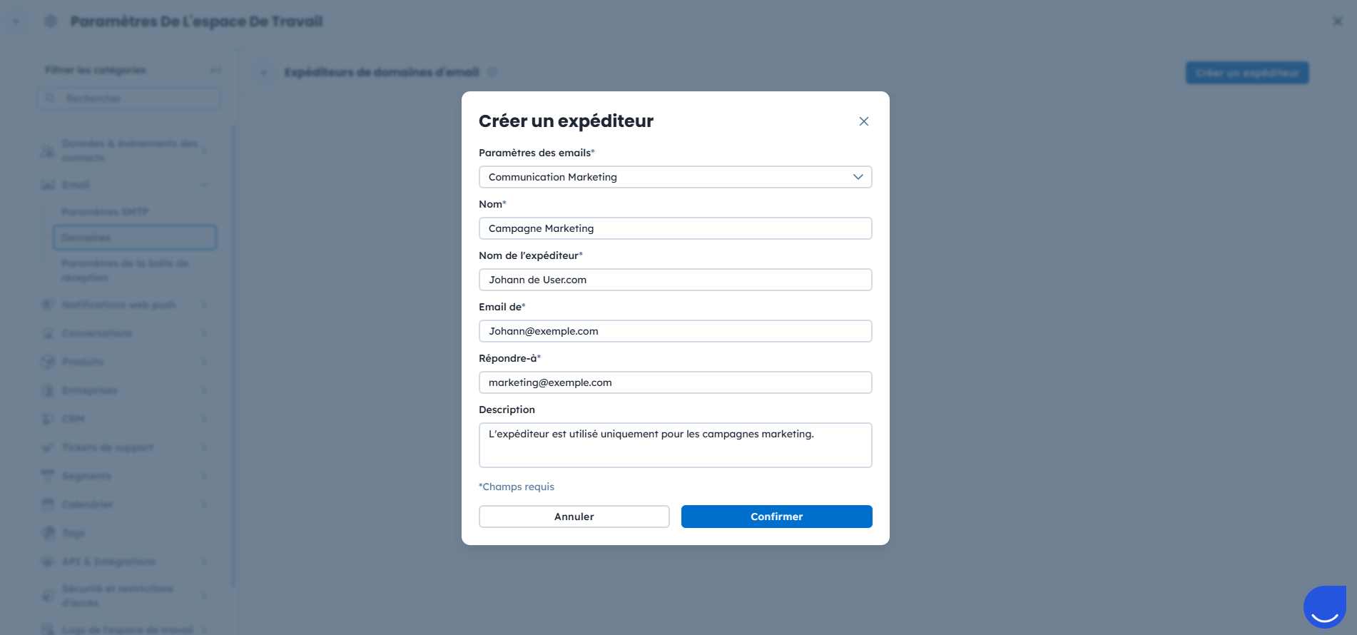 Nom : donnez un nom à l’expéditeur, pour le reconnaître facilement dans votre espace de travail.