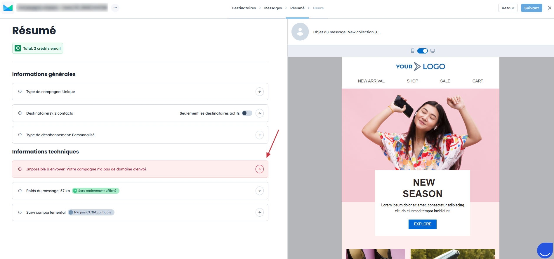 Enfin, à l’étape "Résumé", le système affiche à nouveau les paramètres choisis. Si une anomalie est détectée dans la configuration de l’expéditeur, une alerte s’affichera.