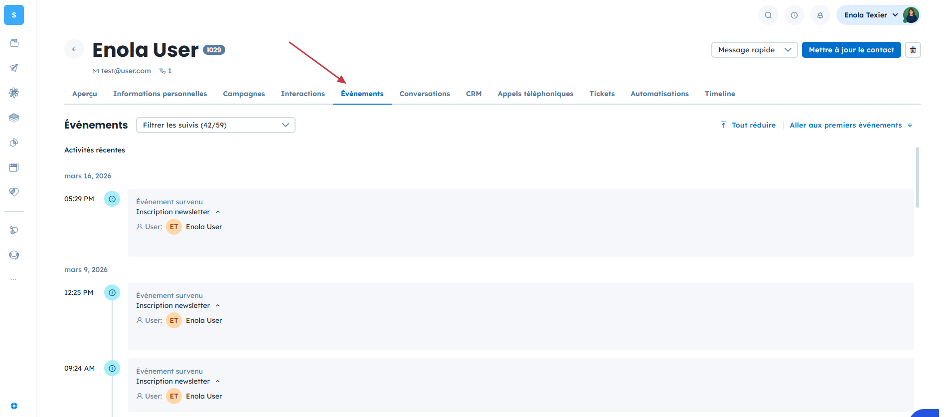Le profil du contact (dans la section “Événements”)
