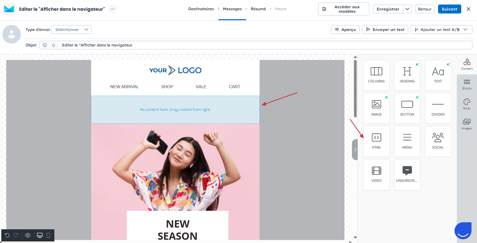 Choisissez l’emplacement où le lien “Afficher dans le navigateur” doit apparaître dans votre modèle d’email. Glissez & déposez le module “HTML” à cet endroit.