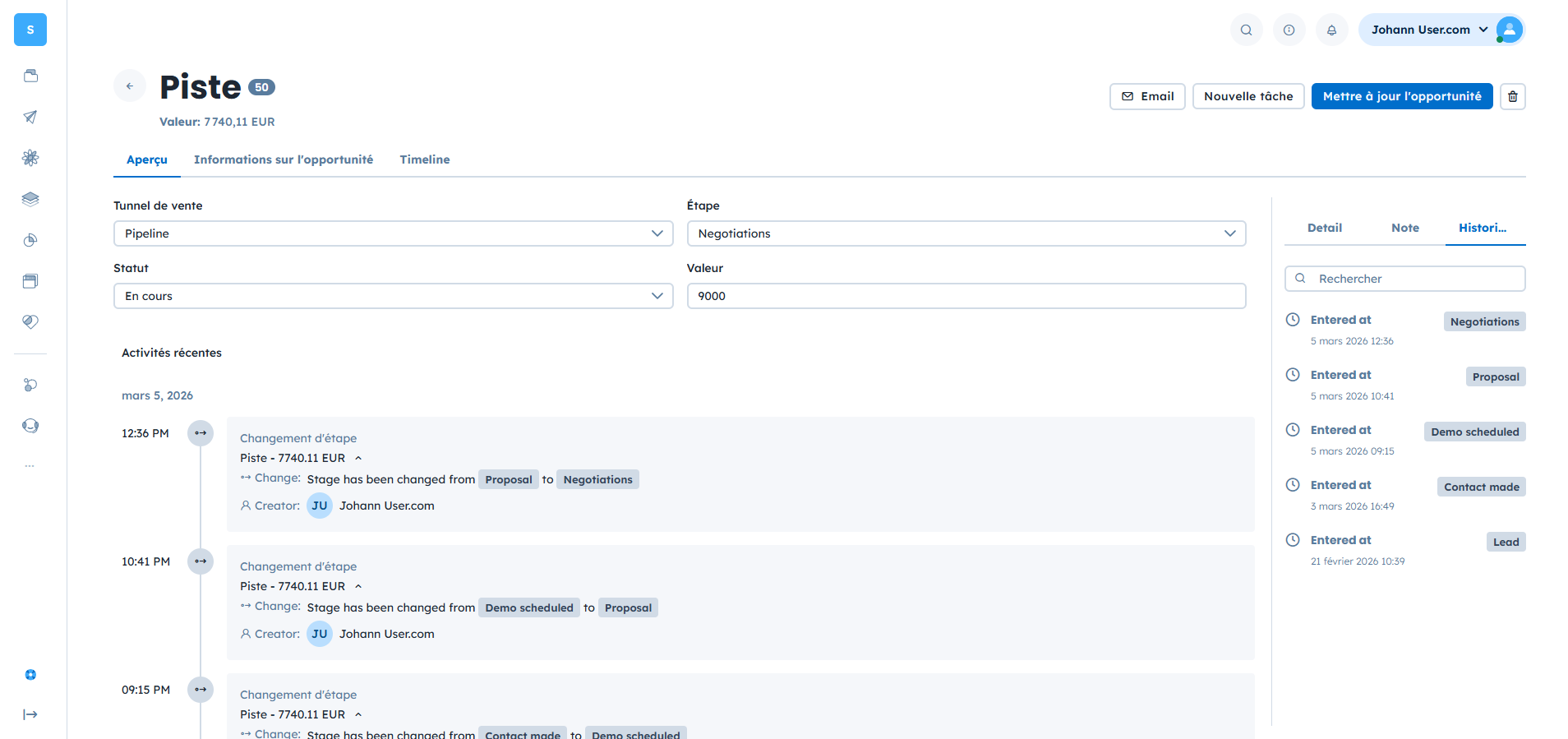 Chaque opportunité possède son propre profil dans lequel vous pouvez enregistrer les informations clés : valeur de l’opportunité, date de conclusion estimée, étape actuelle, responsable assigné et tâches associées. Vous pouvez créer et gérer les opportunités manuellement ou les générer automatiquement grâce aux automatisations, en fonction du comportement d’un contact ou de certains événements.