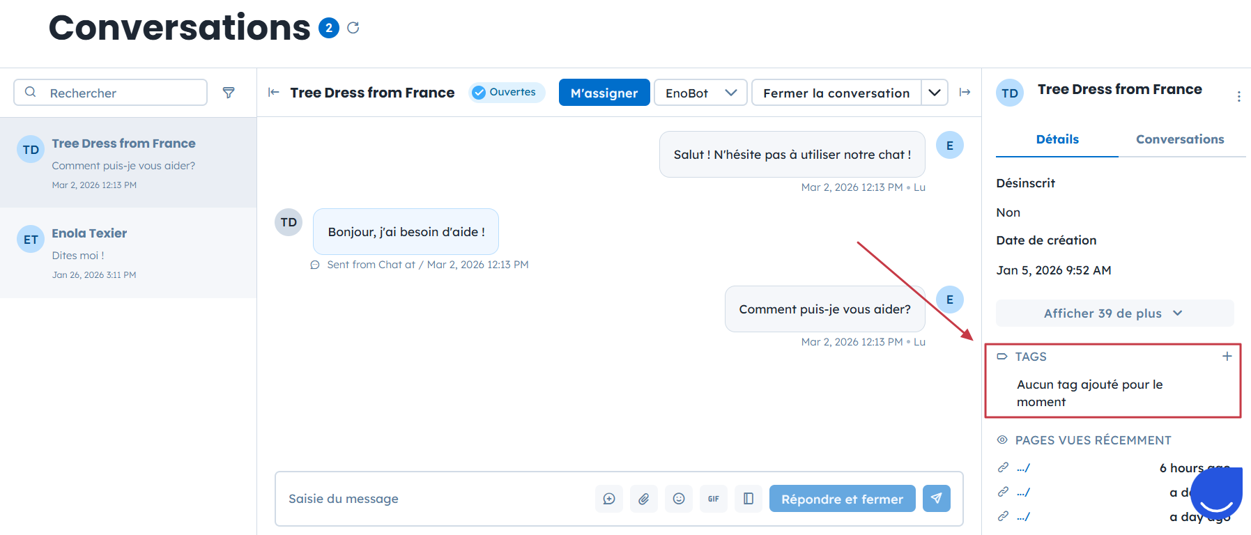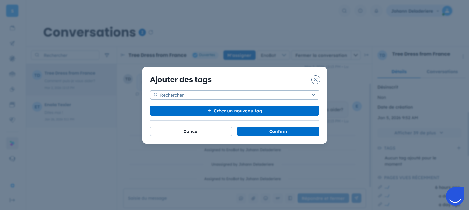 Le module “Conversations” permet d’ajouter ou de supprimer des tags en temps réel, pendant un échange avec un contact. C’est particulièrement utile pour les équipes de ventes et de support.