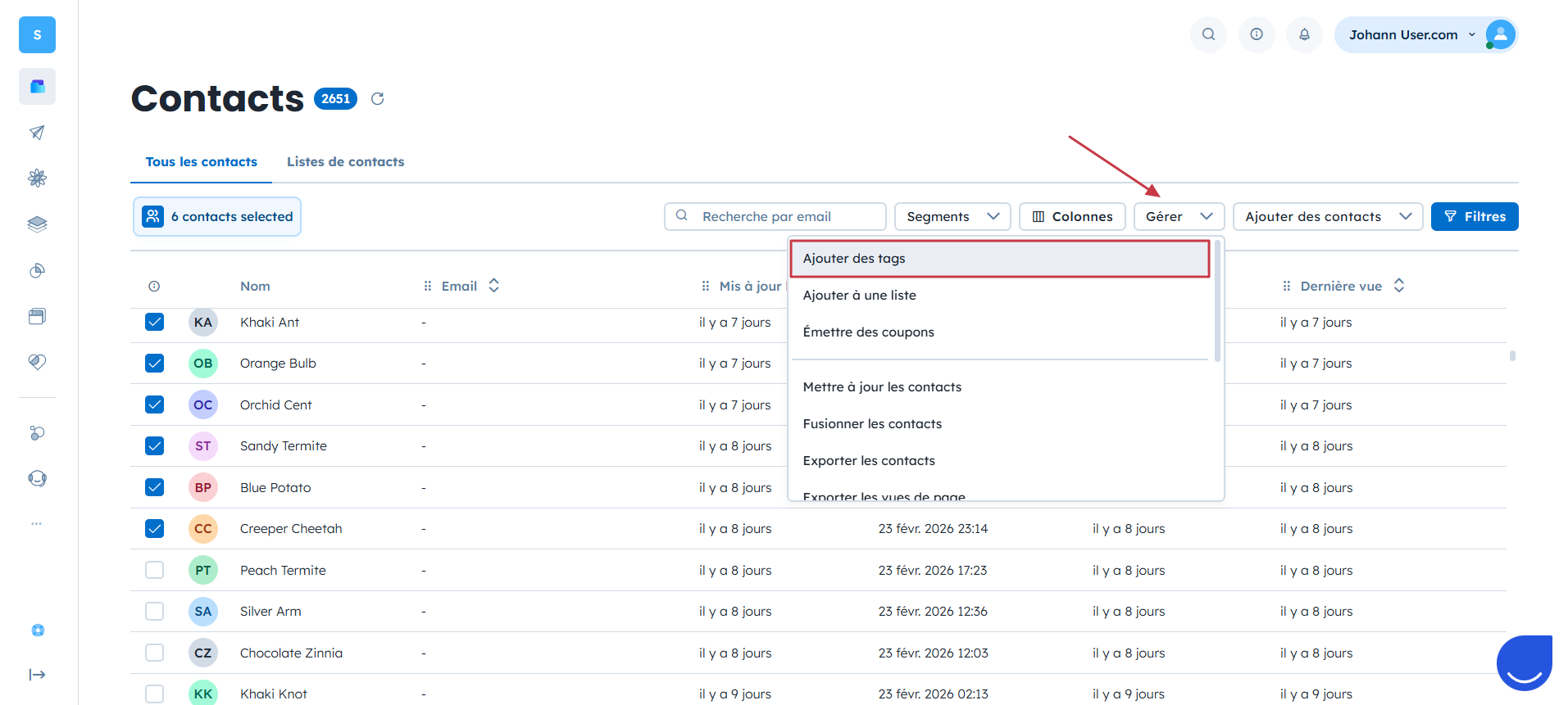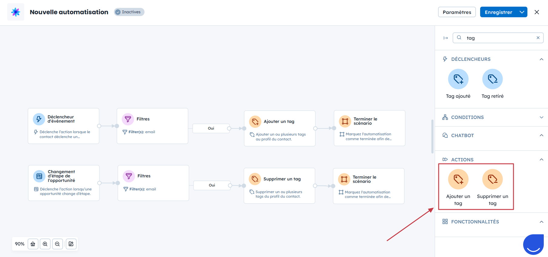 Les automatisations sont la méthode la plus efficace pour gérer les tags à grande échelle. Elles permettent d’ajouter ou de supprimer des tags automatiquement en fonction du comportement d’un contact, de valeurs d’attributs ou d’autres événements.