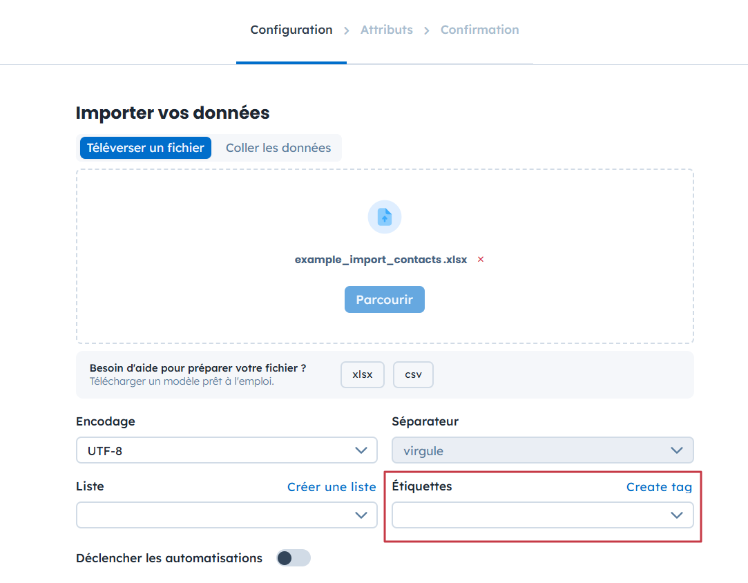 L’import CSV permet d’ajouter des tags à plusieurs objets à la fois. C’est une méthode simple pour garder une trace de leur source. Les tags ajoutés peuvent également déclencher des automatisations.