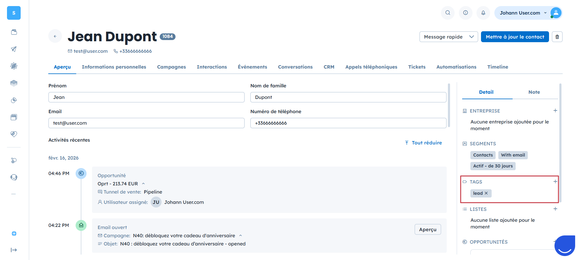 Exemple : Après une démonstration produit, un commercial met à jour le profil d’un prospect en ajoutant le tag “Fort intérêt” pour indiquer qu’un suivi est nécessaire.