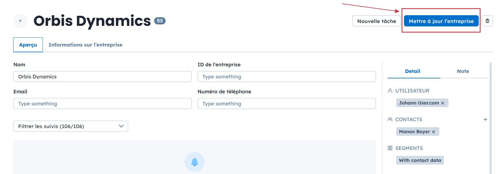 2. Bouton “Mettre à jour l’entreprise”