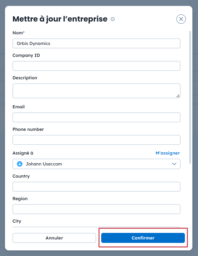 Le formulaire “Mettre à jour l’entreprise” permet de modifier n’importe quel attribut de l’entreprise.