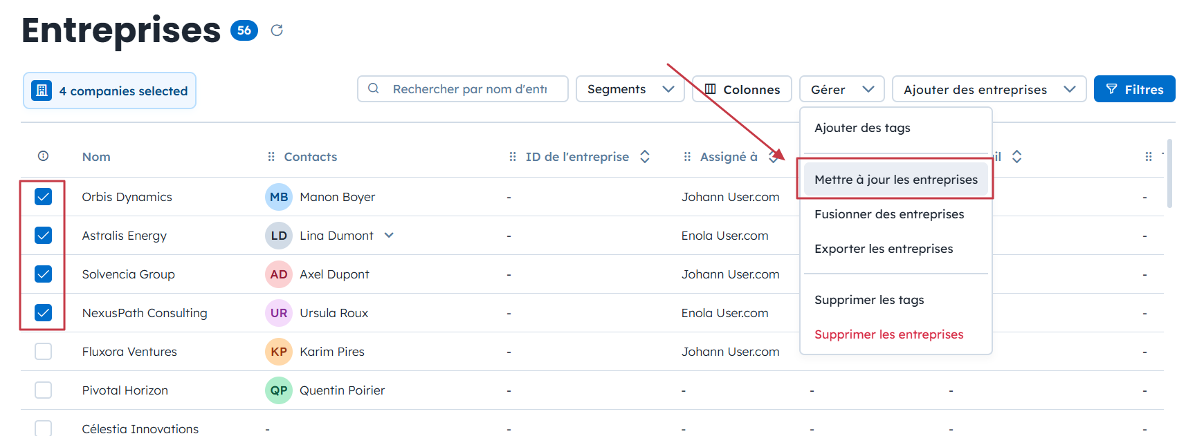 Vous pouvez également mettre à jour plusieurs entreprises simultanément depuis la section “Entreprises”.