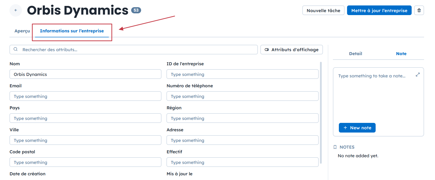 Sous le nom de l’entreprise, ouvrez l’onglet “Informations sur l’entreprise” afin de modifier les valeurs des attributs.