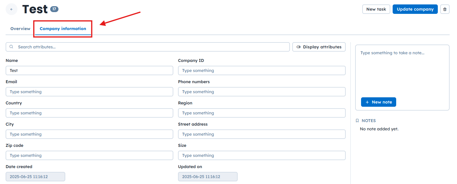 Open the “Data” → “Companies” section, select a company to open its profile. Below the name of the company, open the “Company information” panel to update attribute values.