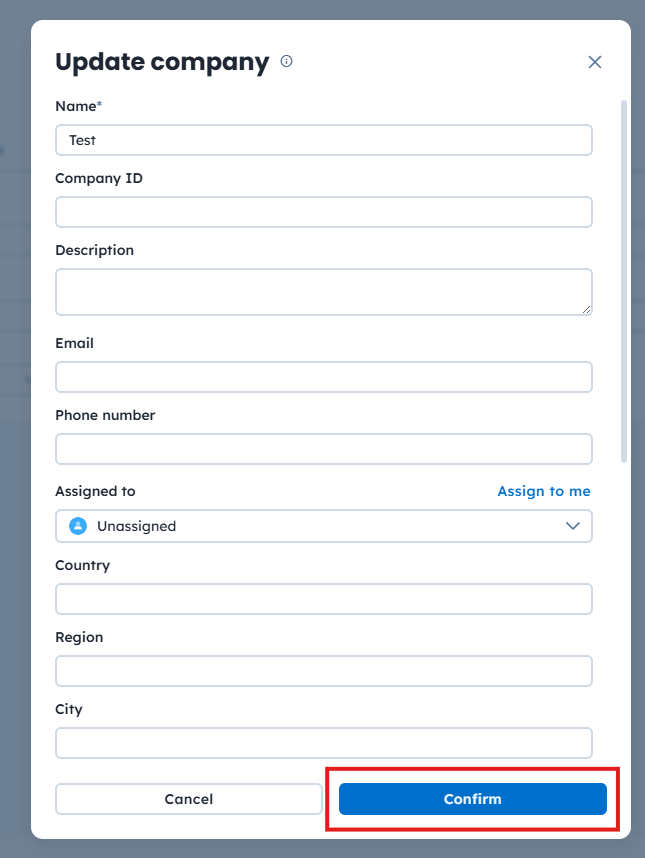 Open the “Data” → “Companies” section, select a company to open its profile. Find the blue “Update company” button on the top-right corner of the profile, click on it, update the company information, and confirm the changes to save them.