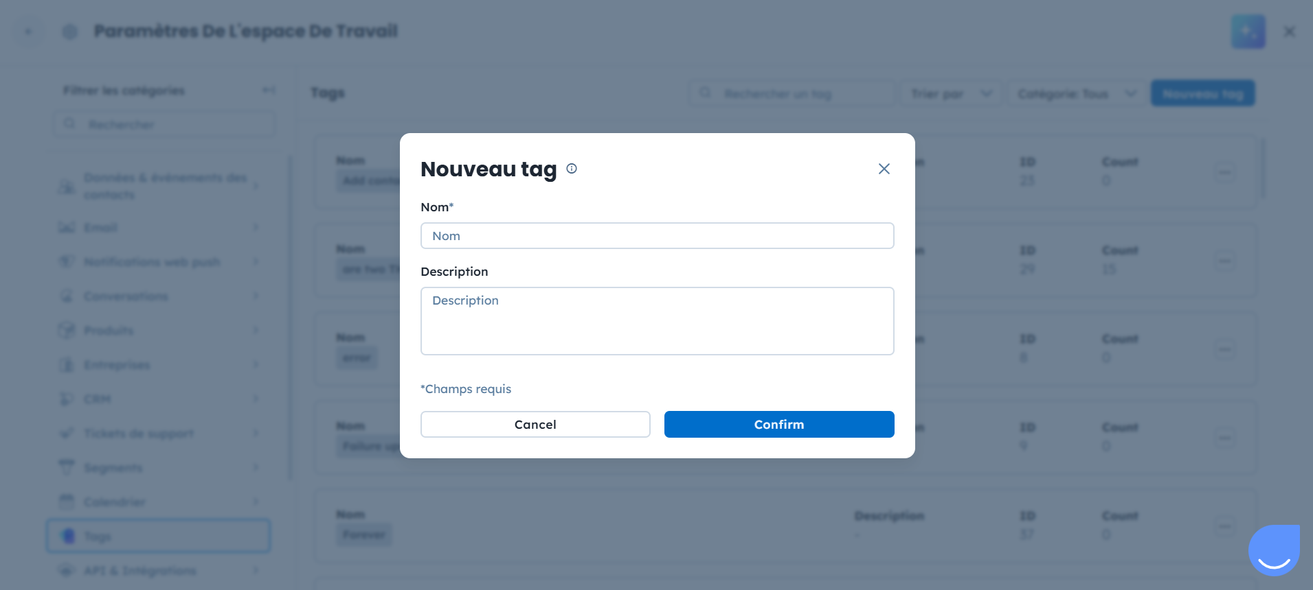 Avant d’utiliser des tags sur la plateforme, vous devez les créer, idéalement en ajoutant une description claire.
