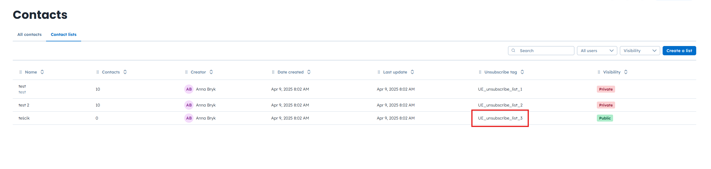 Copy the value from the “Unsubscribe tag” column for the list you want to use. This tag is unique for every list. It includes a dedicated ID of the list.