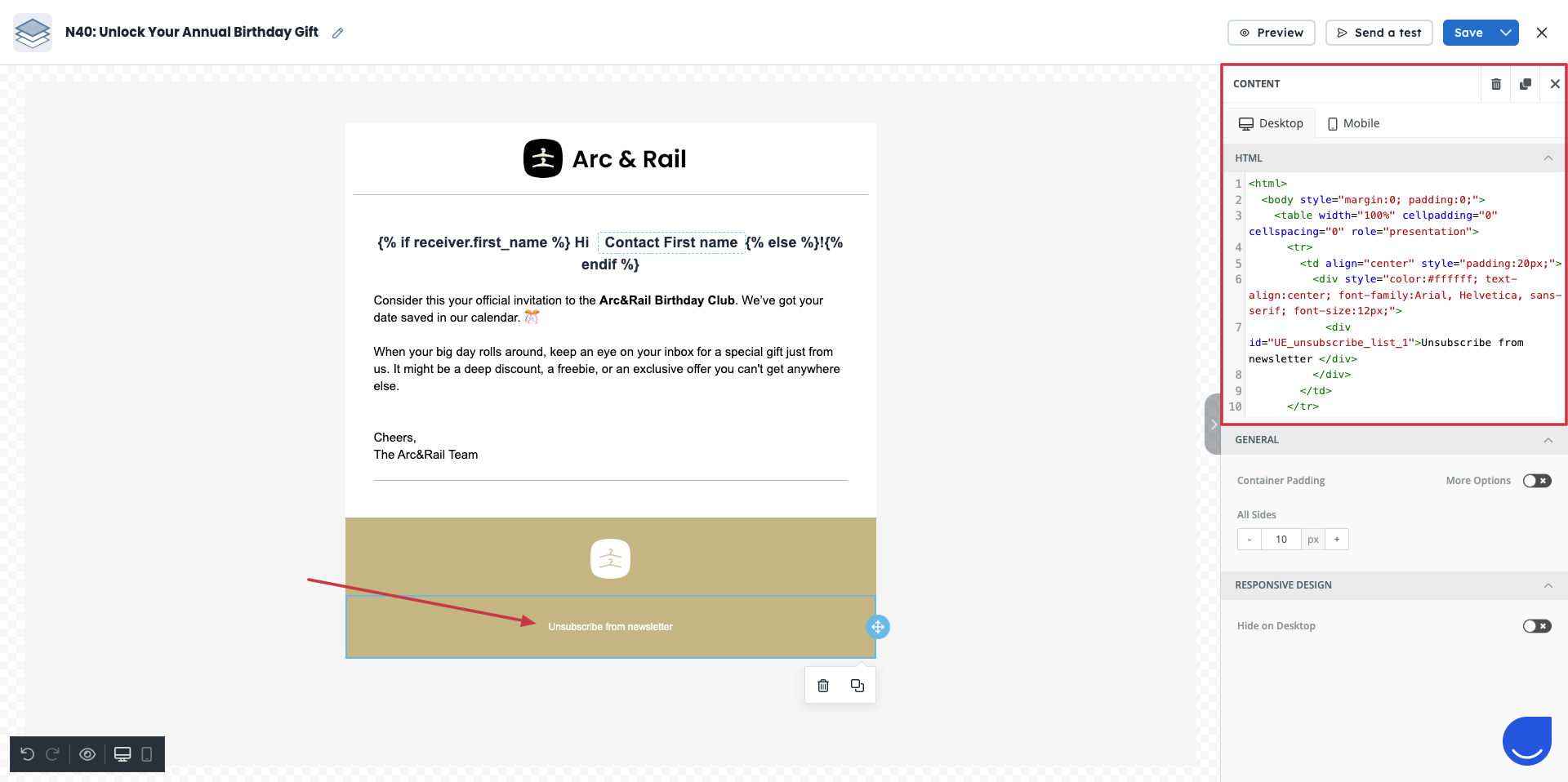 Instead of asking recipients to unsubscribe from all emails, an “Unsubscribe From Specific List” link lets them opt out of only the messages they’re no longer interested in, such as a particular newsletter or promotional campaign. This means subscribers can stay connected to the content that matters to them, while you keep a healthier, more engaged contact list. It also helps reduce spam complaints, improves deliverability, and supports compliance with email marketing regulations.