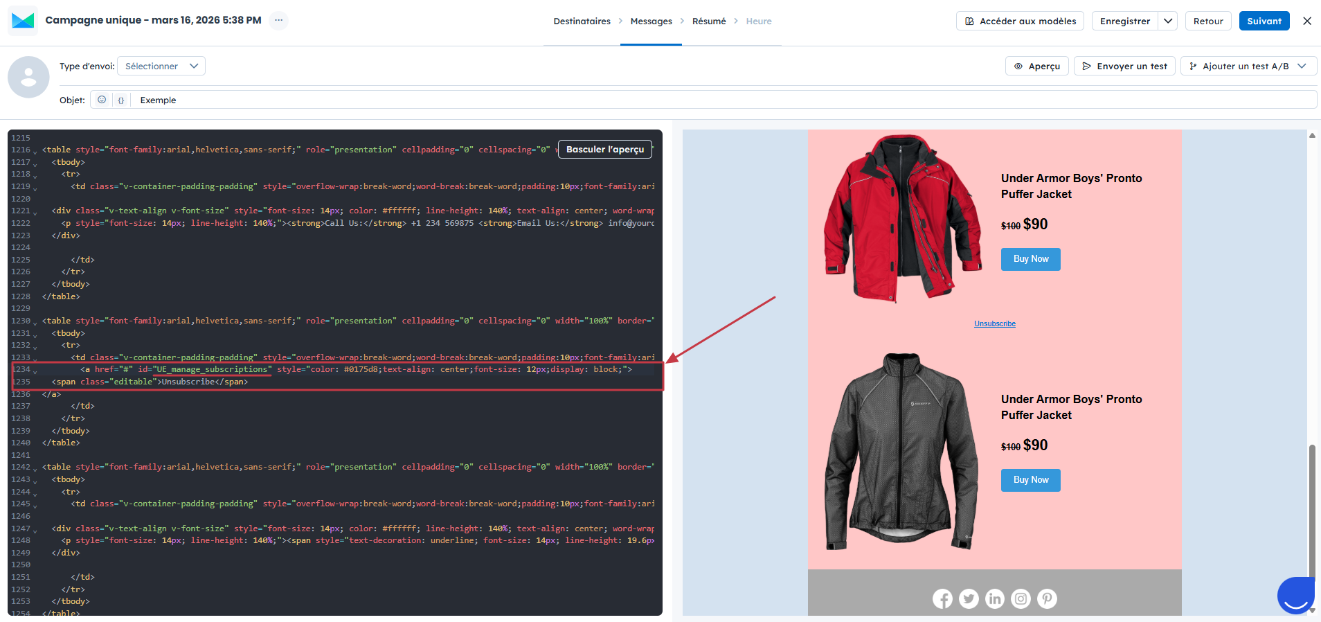 <a id="UE_manage_subscriptions">Gérer mes préférences d’abonnement</a>Ce code génère un lien cliquable qui redirige vers la page de gestion des abonnements.