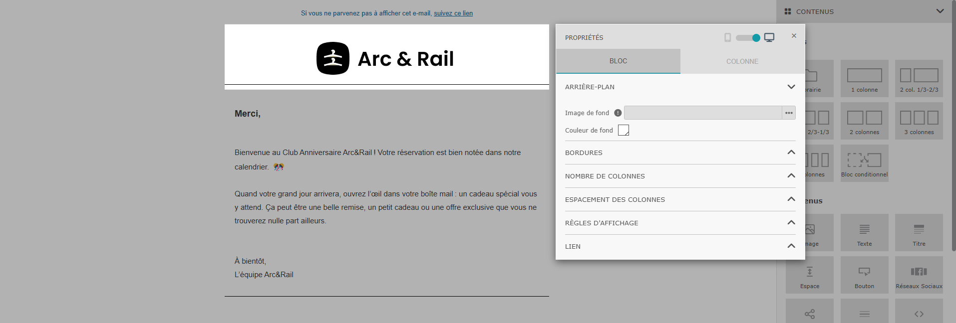 Cette limite a été fixée volontairement. Six colonnes représentent le maximum recommandé pour assurer un affichage fiable sur la majorité des clients de messagerie. Cela permet d’obtenir des mises en page plus lisibles et d’optimiser l’affichage sur les appareils et les boîtes de messagerie.