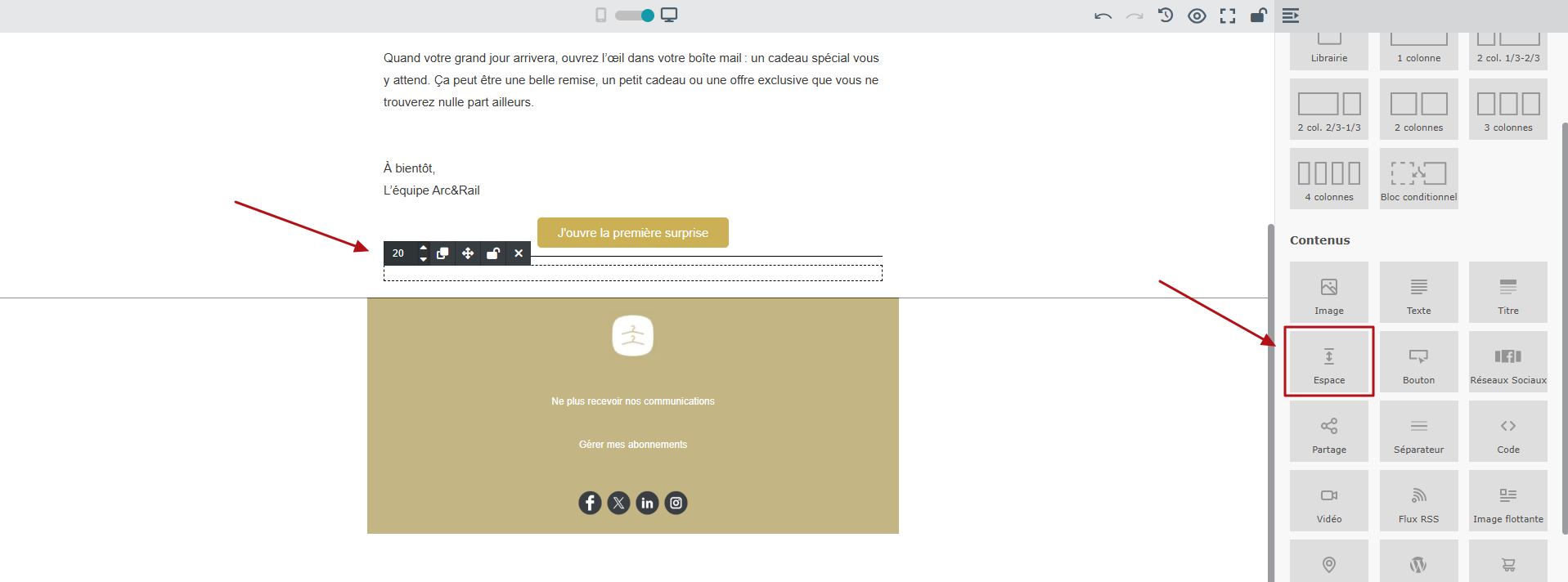 Le module “Espace” peut être inséré n’importe où dans le contenu de vos emails, pour proposer une mise en page plus aérée.