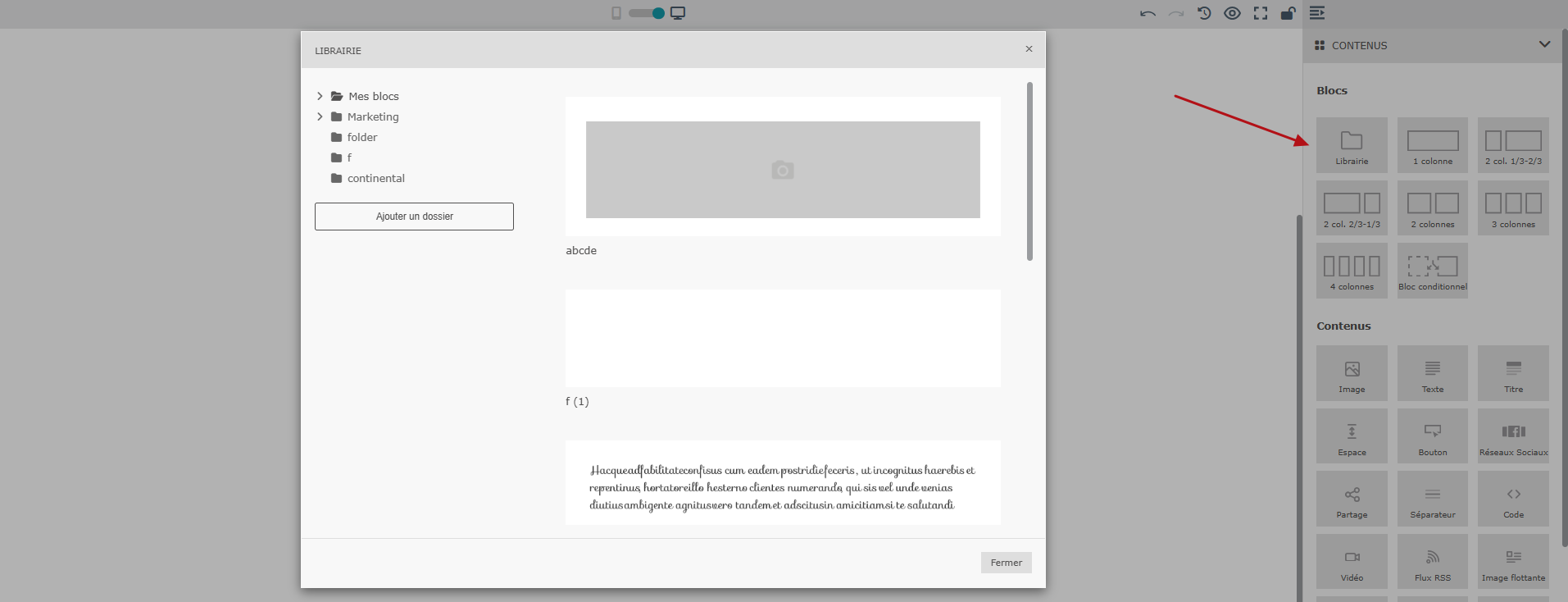La “Librairie” est accessible directement depuis le nouvel éditeur visuel, dans la section “Blocs” située à droite de l’éditeur. En un clic, vous pouvez insérer les blocs enregistrés dans la campagne sur laquelle vous travaillez.