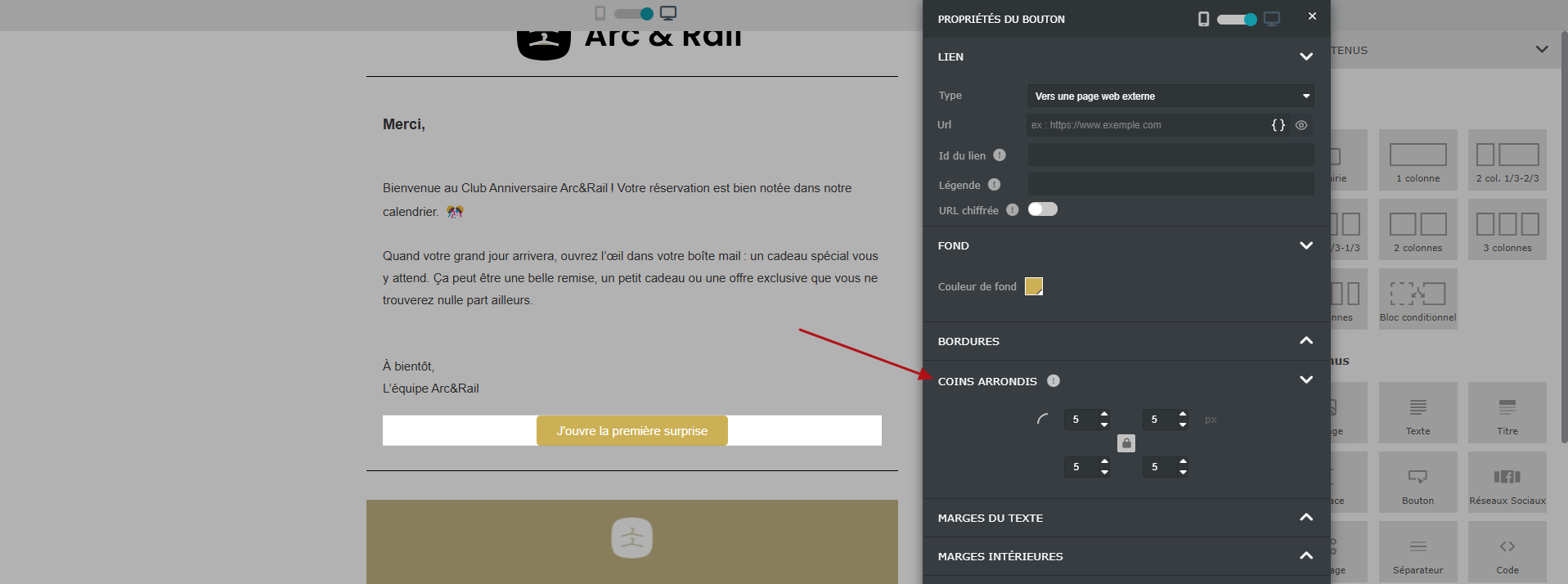 Nouvel éditeur visuel : Les coins arrondis sont directement intégrés et configurables dans les propriétés de chaque bloc.