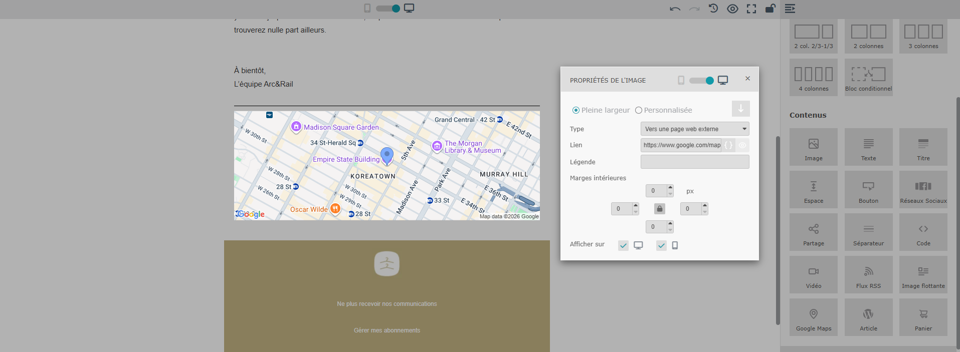 Le module “Google Maps” vous permet d’afficher des lieux physiques dans vos emails. Il suffit de renseigner une adresse pour générer automatiquement :