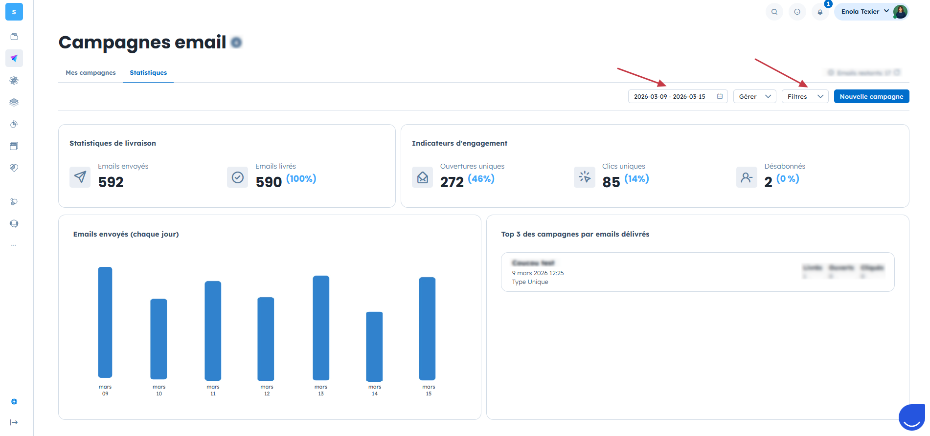 Vous pouvez également filtrer la vue par période en haut de la section “Campagnes” pour isoler les résultats sur une durée précise.