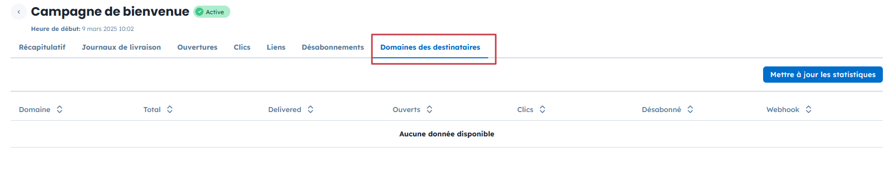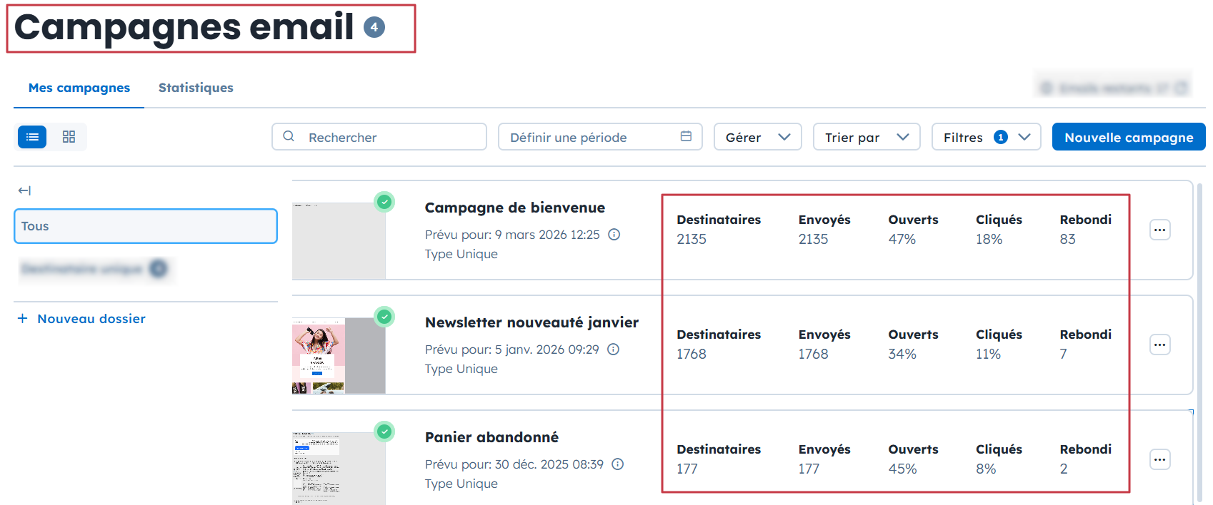 Pour obtenir une vue d’ensemble des statistiques de vos campagnes email, accédez à “Campagnes” → “Email” → “Statistiques”