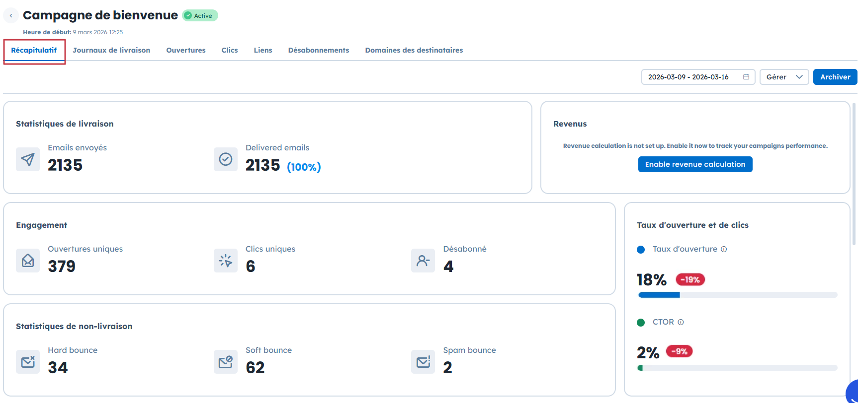 Engagement : Total des ouvertures uniques, des clics et des désinscriptions.