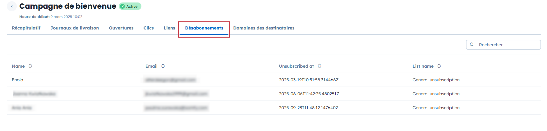 Cette section liste les contacts ayant cliqué sur le lien de désinscription. Elle vous aide à surveiller la qualité de votre base et à ajuster votre ciblage ou votre fréquence d'envoi si nécessaire.