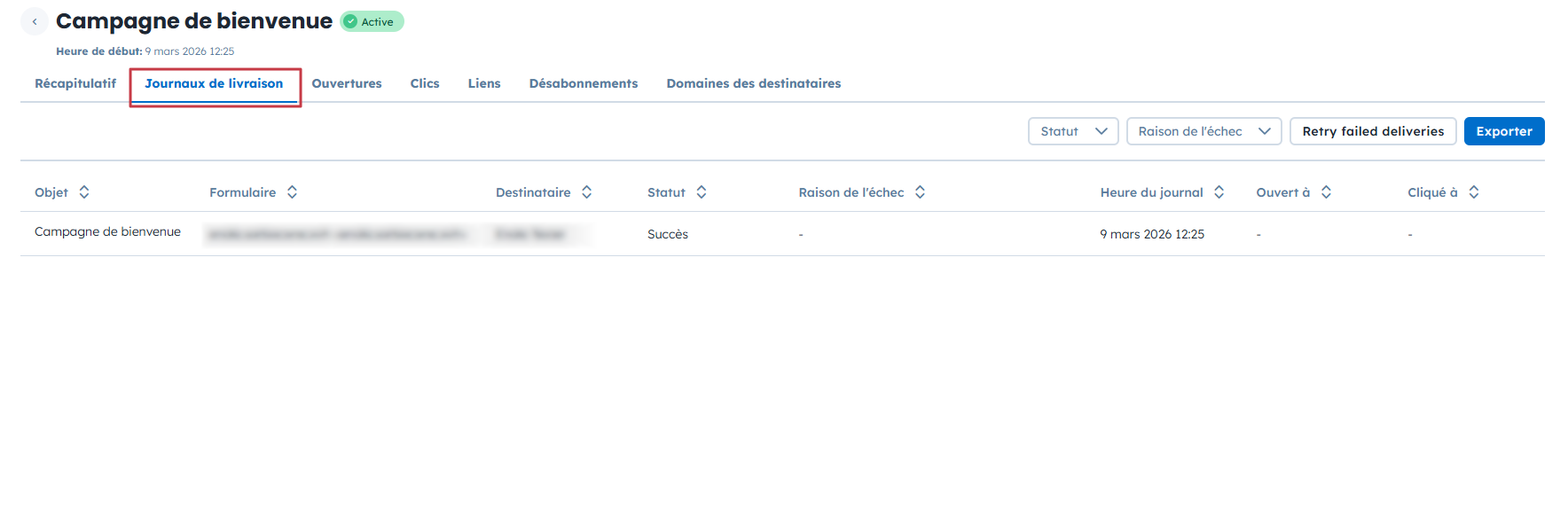 Cette section est particulièrement utile pour analyser les problèmes de délivrabilité ou les échecs d’envoi.
