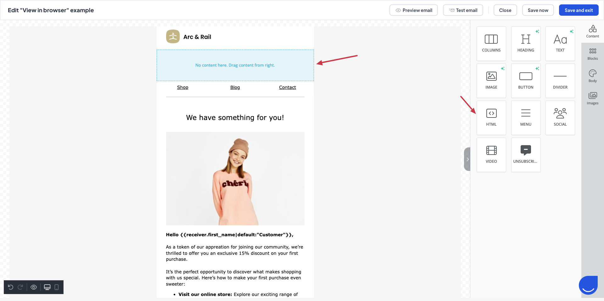 Decide where the browser preview link should appear in your email template. Drag the “HTML” module into that location.